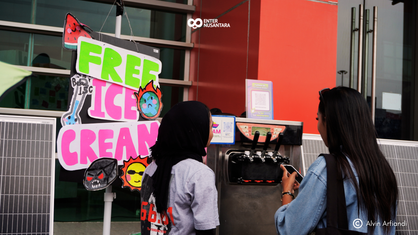 At the festival, Enter Nusantara had two cool installations that used 100% solar power. The Solar Ice Cream Machine was the main attraction. In the hot weather, Enter Nusantara gave out free ice cream made with a solar panel-powered machine. This was a fun way to show that clean energy is real, easy to get, and can be used every day.