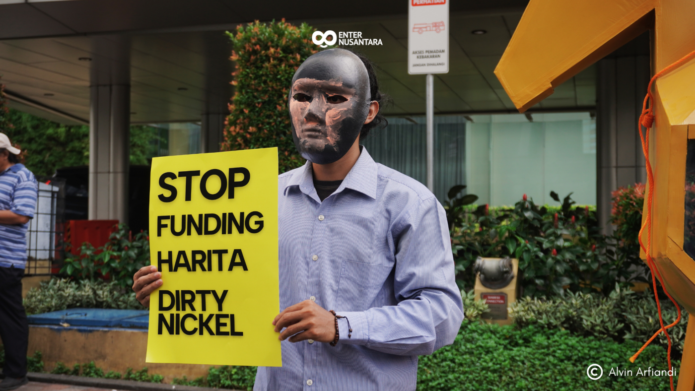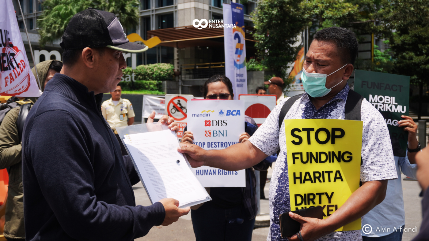 The protest specifically targeted banks that continue to fund the Harita Group’s nickel smelter project on Obi Island, North Maluku.