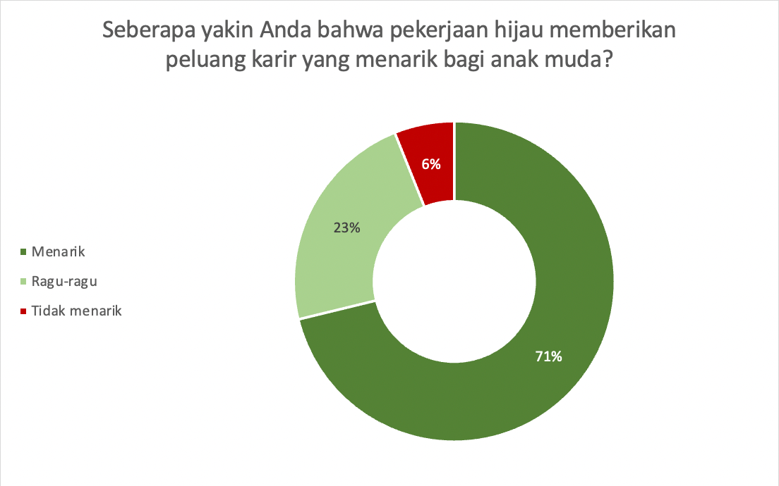 More than half of respondents (55%) were unfamiliar with the concept of green jobs, and 68% did not know their potential in Indonesia. Among those informed, 72% learned about them through social media. Only 14% received information from universities, and just 0.3% through government outreach.